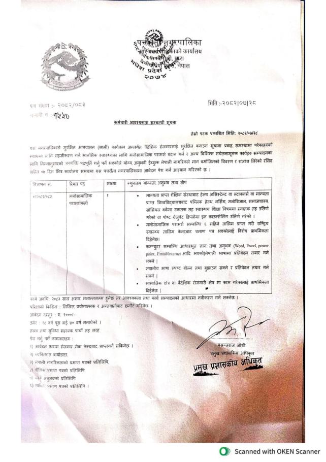 कर्मचारी आवश्यकता सम्बन्धी सूचना!!!