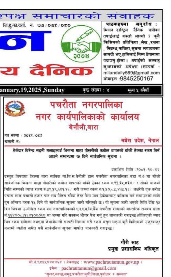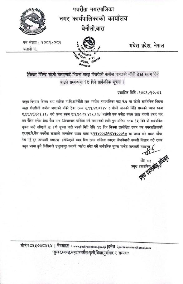 ठेक्केदार विरेनद्र सहनी मलाहलाई भिखना माछा पोखरीको कबोल बापतको बाकी ठेक्का रकम तिर्न आउने सम्बन्धमा १५ दिने सारेवजनिक सूचना!!!